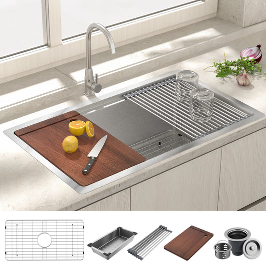 LAFATI Stainless Steel Utility Sink - 304 SUS, Free Standing Single Bowl with Large Work Station, Faucet, and Drainboard (39 Inch)