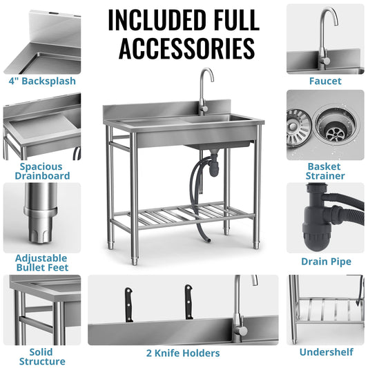 Lafati 304 Stainless Steel Freestanding Utility Sink Set - 39.5" Single Bowl with Faucet, Drainboard & Adjustable Feet for Outdoor, Garden, Garage, and Commercial Use