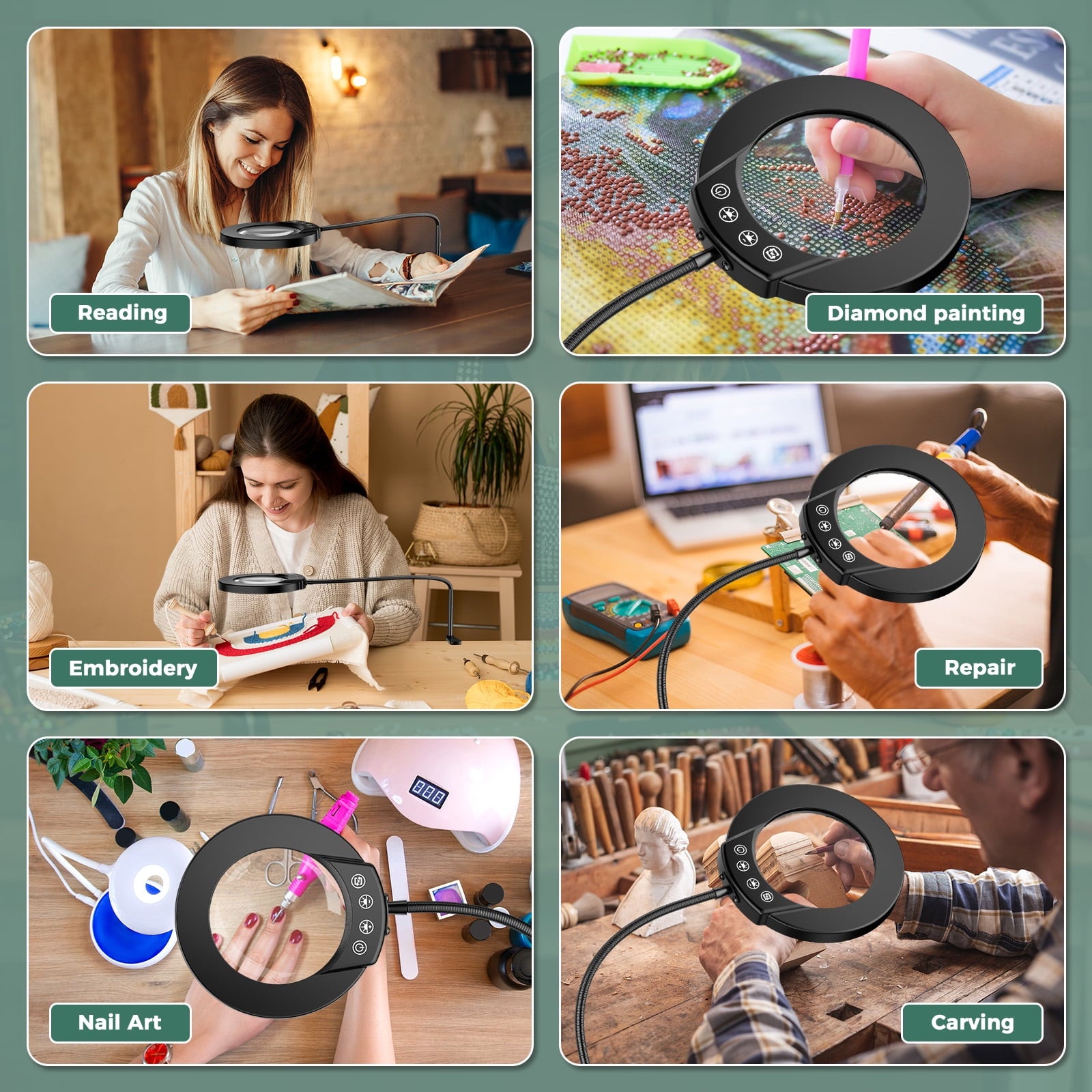 Unlock clear, hands-on detail with our 10X Magnifying Glass with Light, offering an 8-inch heat-resistant optical glass lens for crisp viewing. Designed with comfort and versatility in mind, this magnifying glass is an essential tool. It features 5 color modes and 5 brightness levels, allowing you to customize the light. The Magnifying Glass with Light also comes with an eco-friendly 72 LED light design that conserves energy while protecting your eyes. The flexible 360° gooseneck and durable, scratch-resistant housing material ensure easy maneuverability and lasting quality. Whether for professional repairs, hobbyist projects, or everyday reading, this magnifying glass is a practical solution that's ready to illuminate your work.