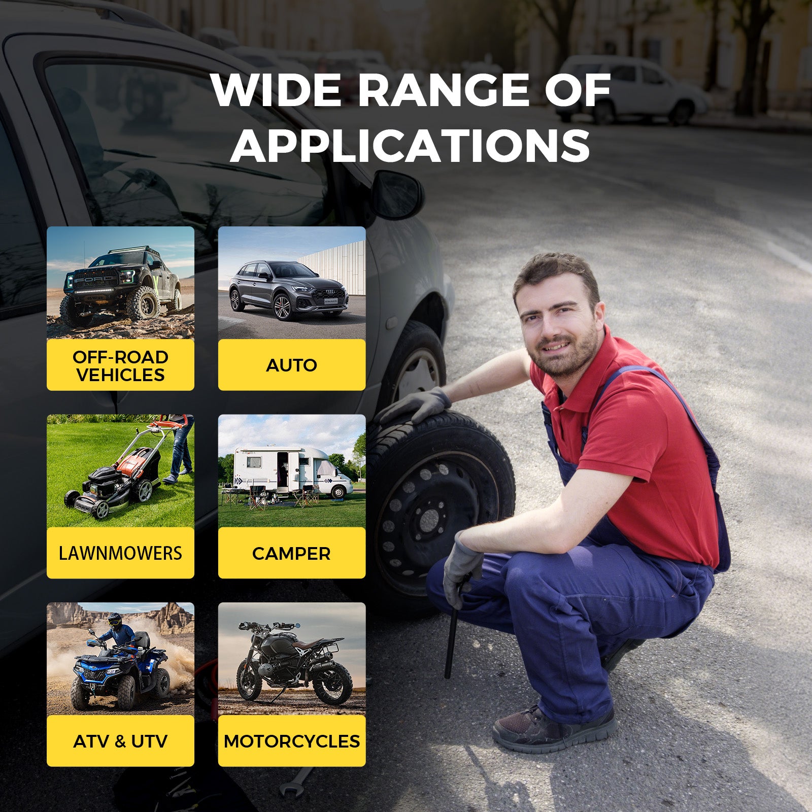 - 【UNIVERSAL TIRE PLUG KIT】 - A single, heavy-duty kit repairs punctures on all tubeless tires: cars, trucks, motorcycles, RVs, ATVs, and tractor tires are all covered.