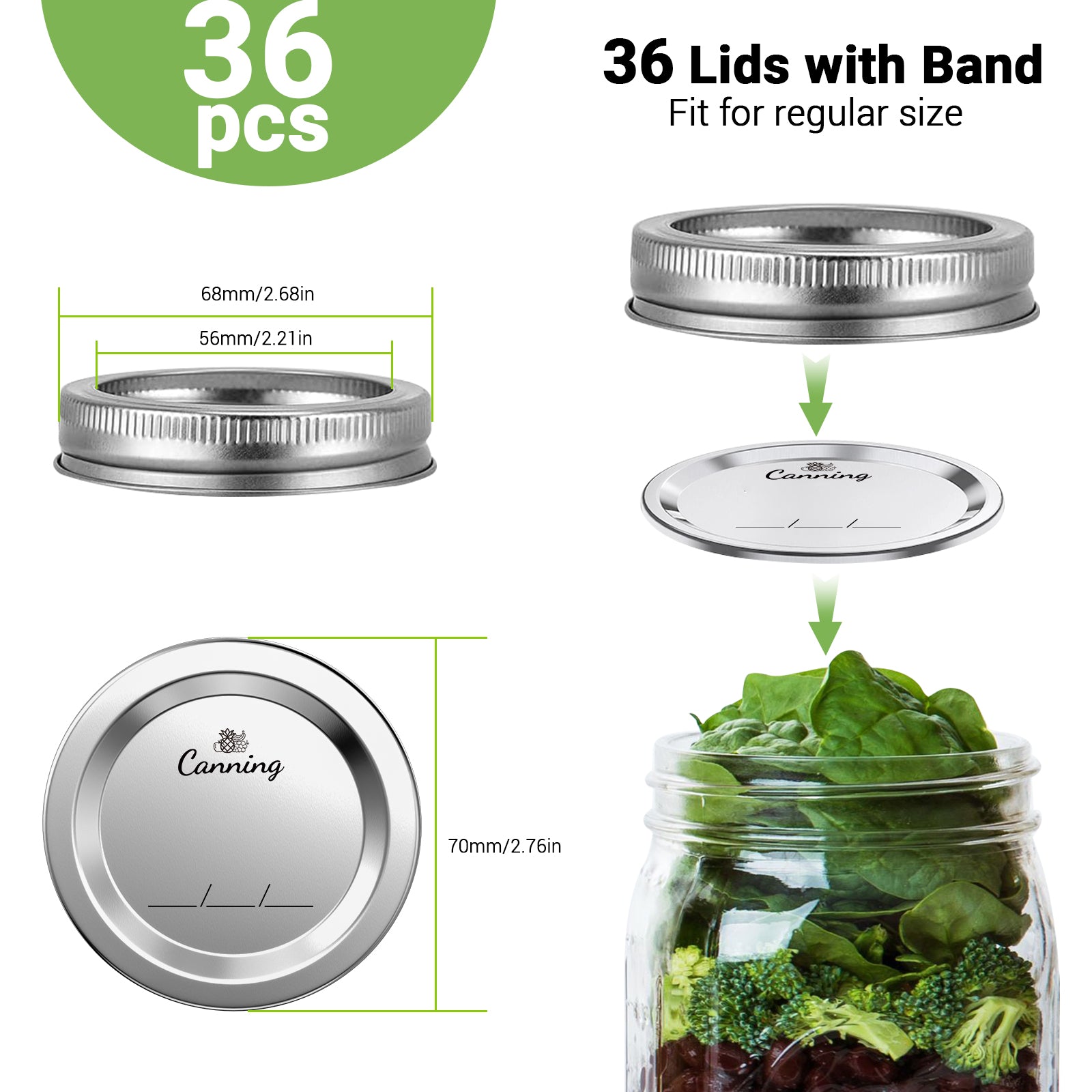Premium Canning Lids with Rings for Regular Mouth Mason Jars Discover our 36-piece canning lid set (18 lids + 18 rings) designed for regular mouth Ball and Kerr jars. Made from food-grade metal with BPA-free silicone seals, these lids ensure an airtight seal for preserving food, jams, and fruits. The reusable rings and single-use lids make them perfect for safe and efficient canning. Ideal for home food preservation, with easy-to-write date markings. Satisfaction guaranteed.