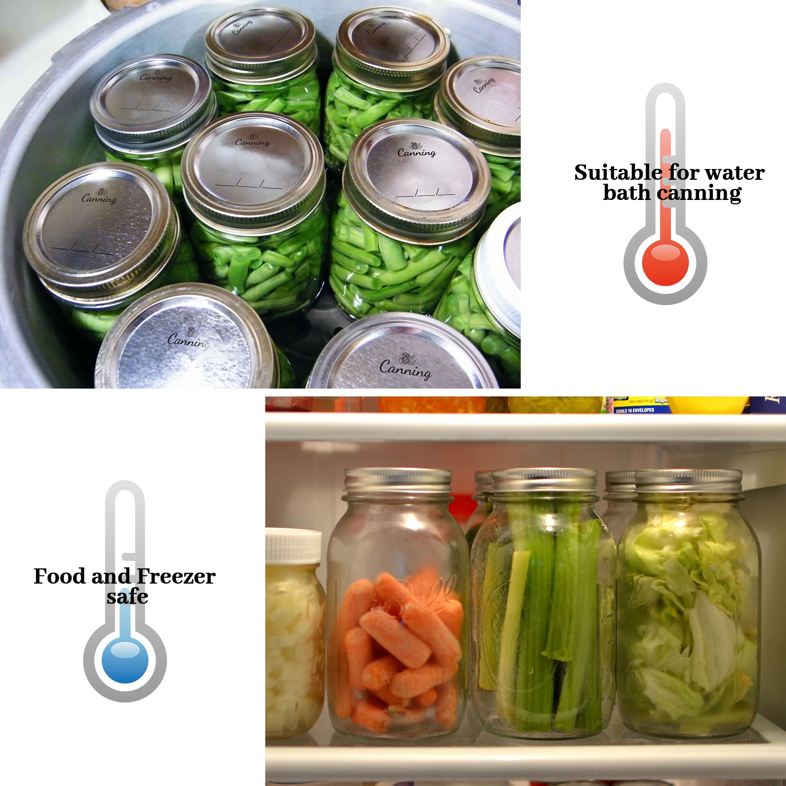 - 🍓 Food grade metal mason jar lids with BPA-free silicone seals. Rings are reusable, lids are for one-time use only.