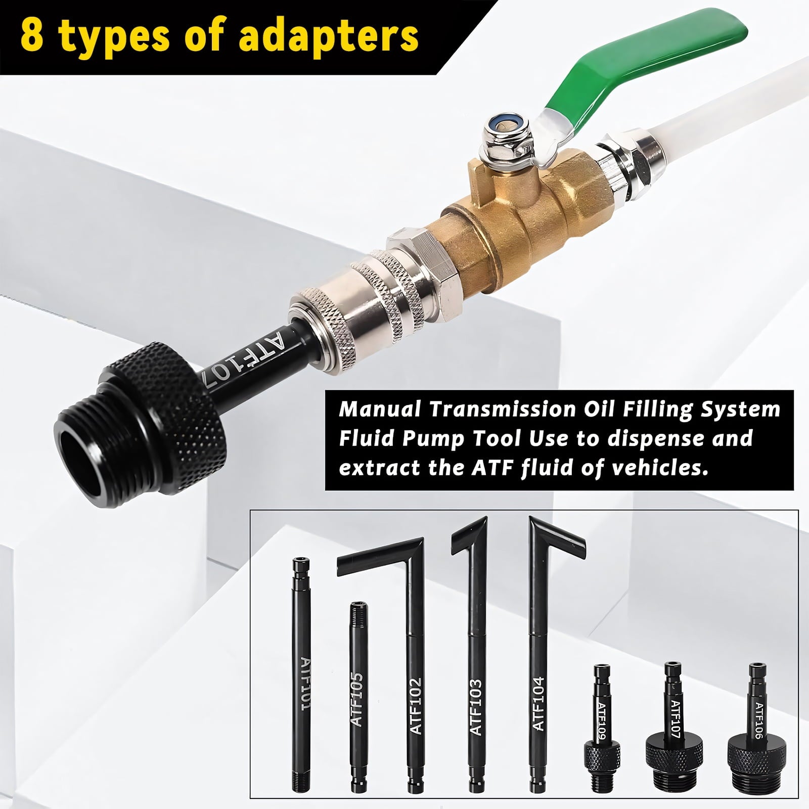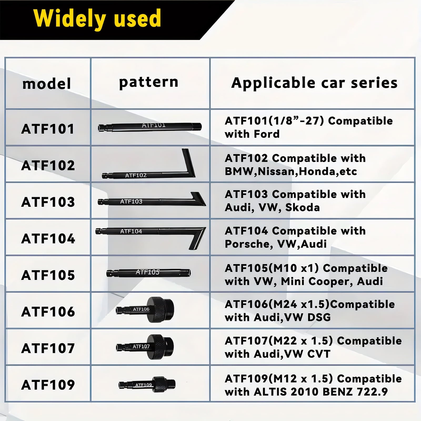 - 【Package List】:Supplied with five multipurpose and three vehicle specific automatic transmission fluid adaptors.