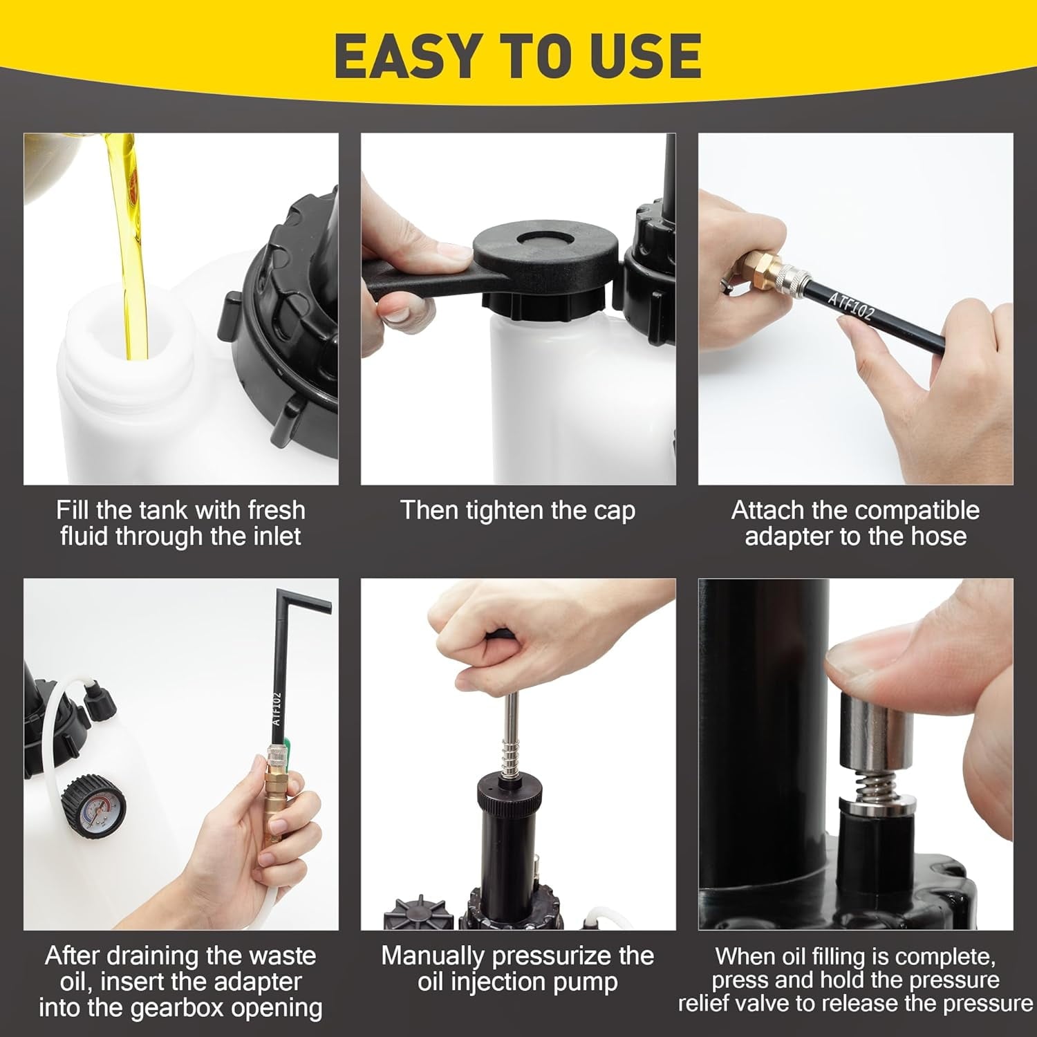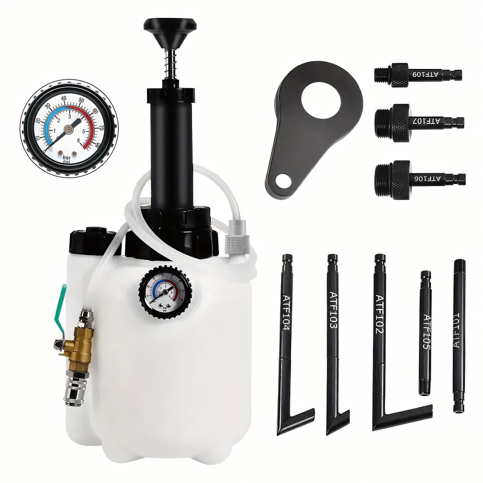 - This transmission oil pump kit includes a pressure gauge and release valve that allows you to precisely control fluid delivery to reduce the risk of overfilling or underfilling and protect your transmission from potential damage.