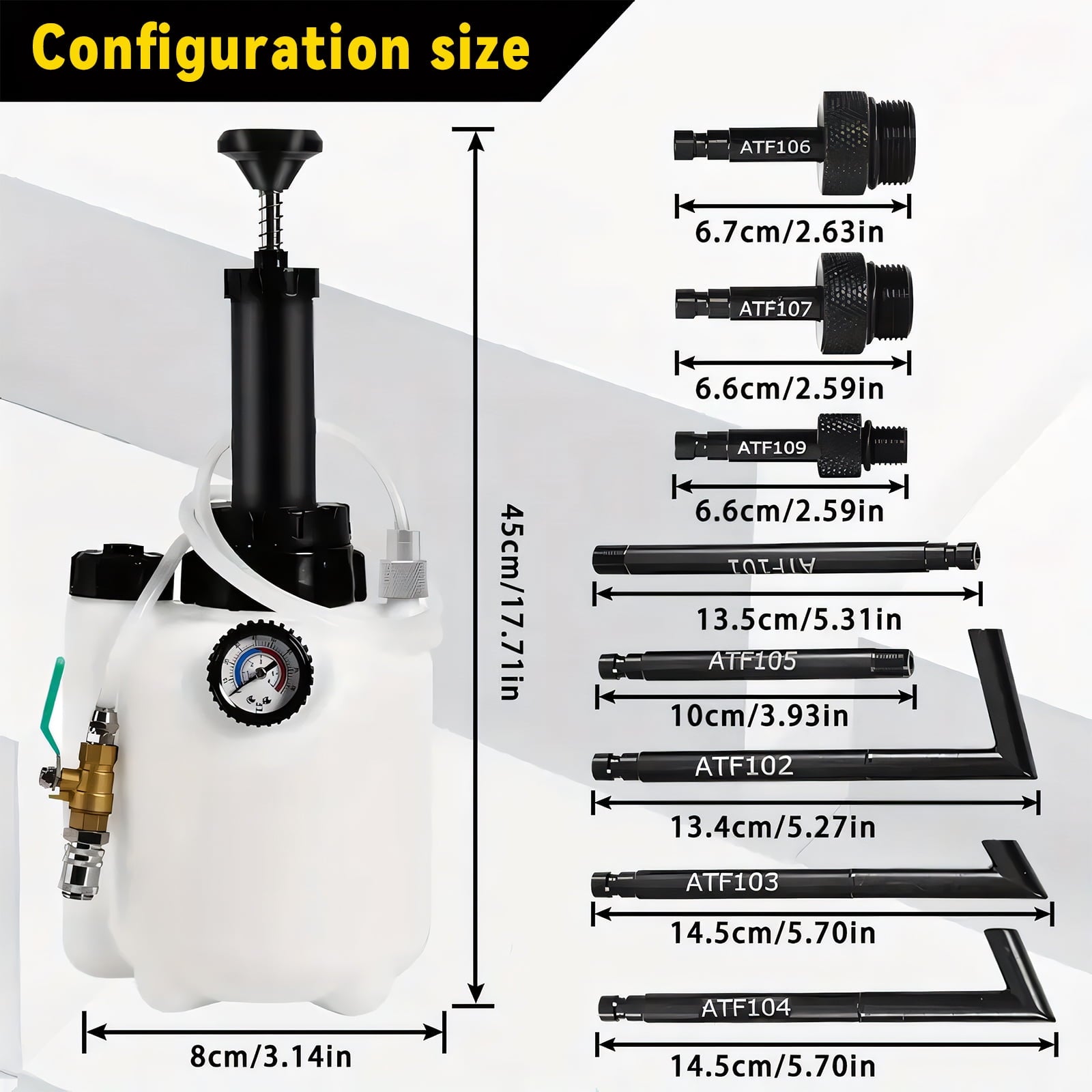 Keep your vehicle's automatic transmission in top shape with this easy-to-use transmission fluid pump kit. It simplifies routine maintenance, ensuring smooth operation and extended transmission life. The durable materials, precise control features, and wide compatibility make it a must-have tool for car owners. Specification: Product size: 485.00x180.00x84.00mm/19.09x7.09x3.31inch Product use: Brake oil replacement and filling Refueling pot capacity: 3L Pressure measurement range: 0-70PSI/0-5BAR Dial diameter: 45mm