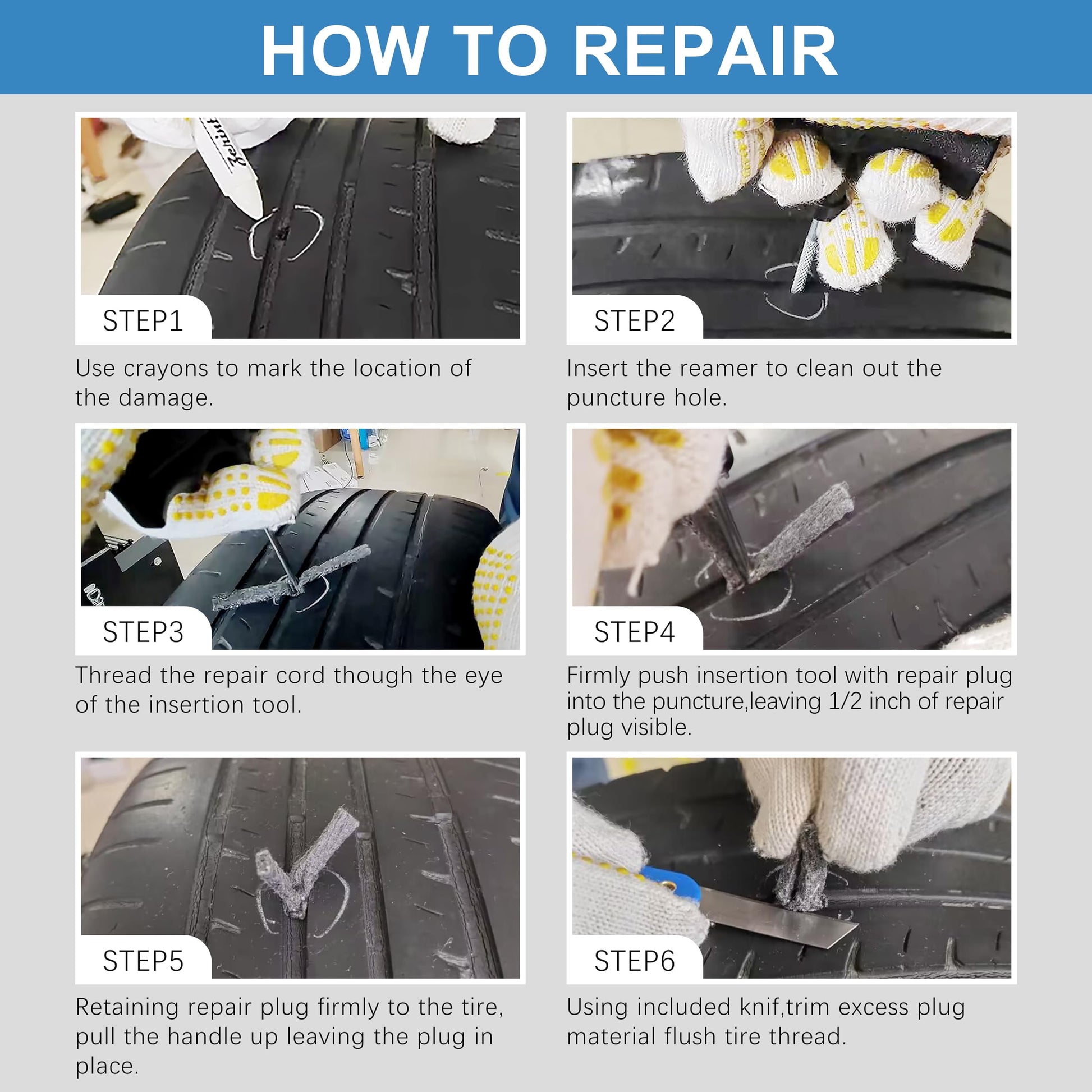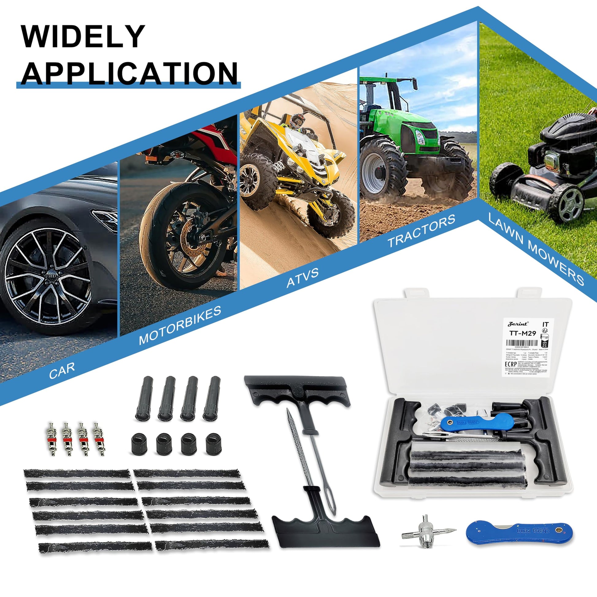 - 【UNIVERSAL TIRE PLUG KIT】 - A single, heavy-duty kit repairs punctures on all tubeless tires: cars, trucks, motorcycles, RVs, ATVs, and tractor tires are all covered.