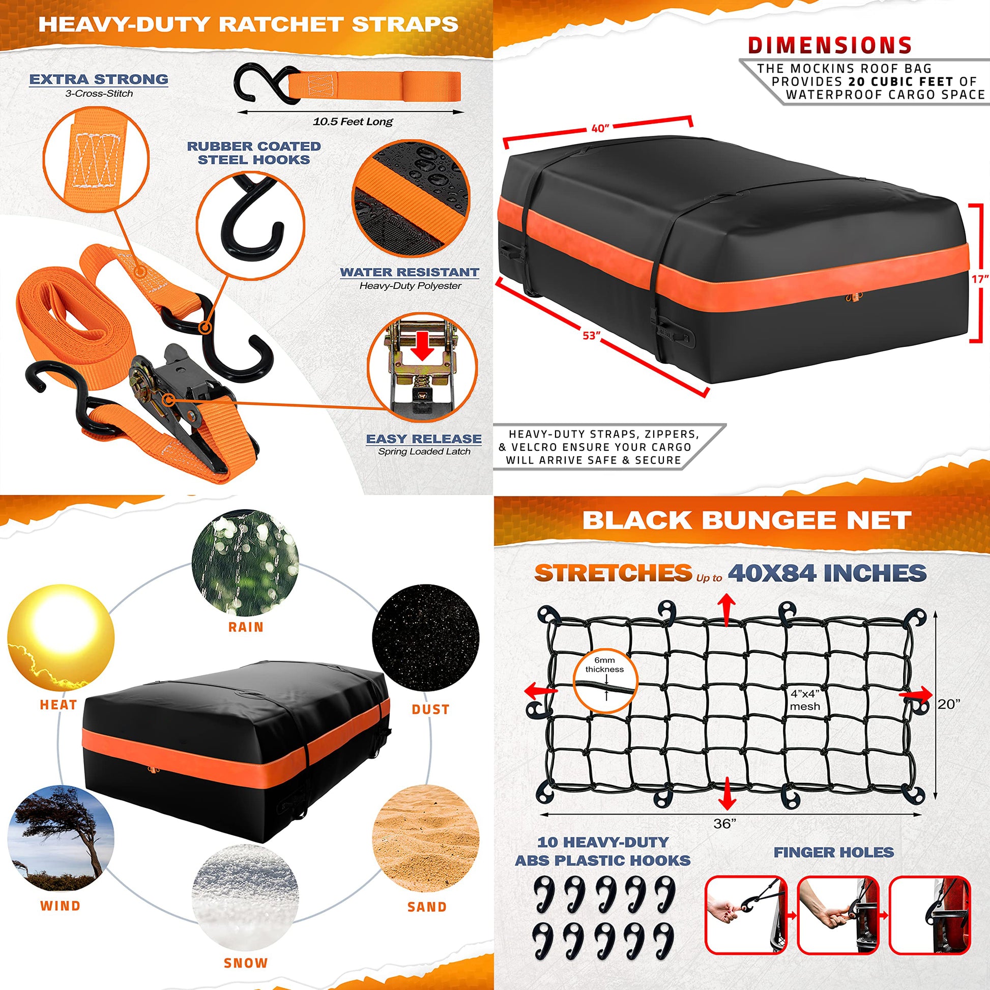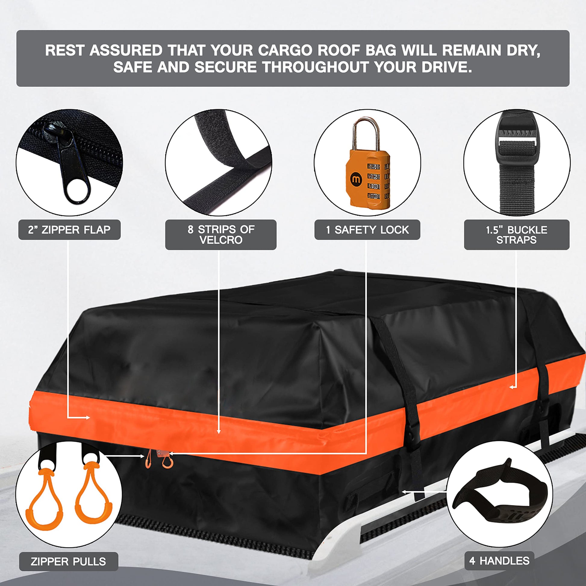 • This rooftop cargo carrier set includes a heavy-duty 20 Cu Ft waterproof rooftop cargo bag (53"x40"x17") made from abrasion-resistant vinyl, designed with carry handles and zipper pulls for easy use. The bag features a 2" zipper flap, 8 pairs of 5.5" Velcro, 4 buckle straps, and a lock to ensure your belongings stay safe and secure during your drive.