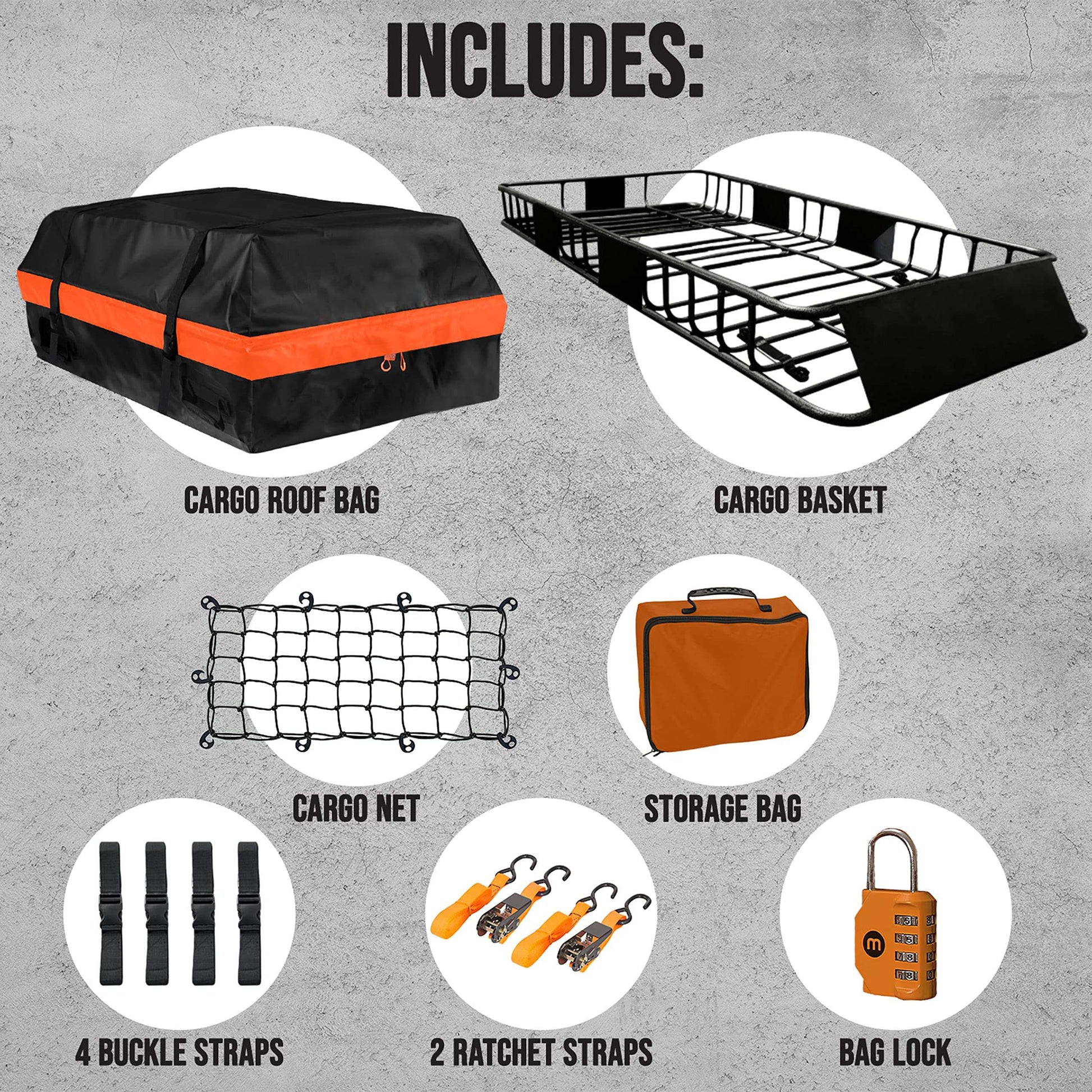 • The car roof cargo carrier is easy to assemble and install on your vehicle's cross bars (cross bars are required). Along with the extendable roof basket, you also receive 2 ratchet straps, a cargo bungee net, and a storage bag, providing everything you need for a hassle-free setup.