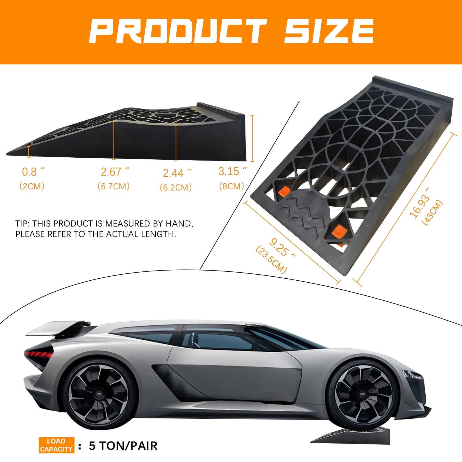 【Specifications】:Dimensions: 17" L x 9-1/4" W x 3" H per rampLoading Angle: 17°Lifting Height: 2.44 inchesLoad Capacity: 6 tons (12,300 lbs per pair)Material: PP (Polypropylene)