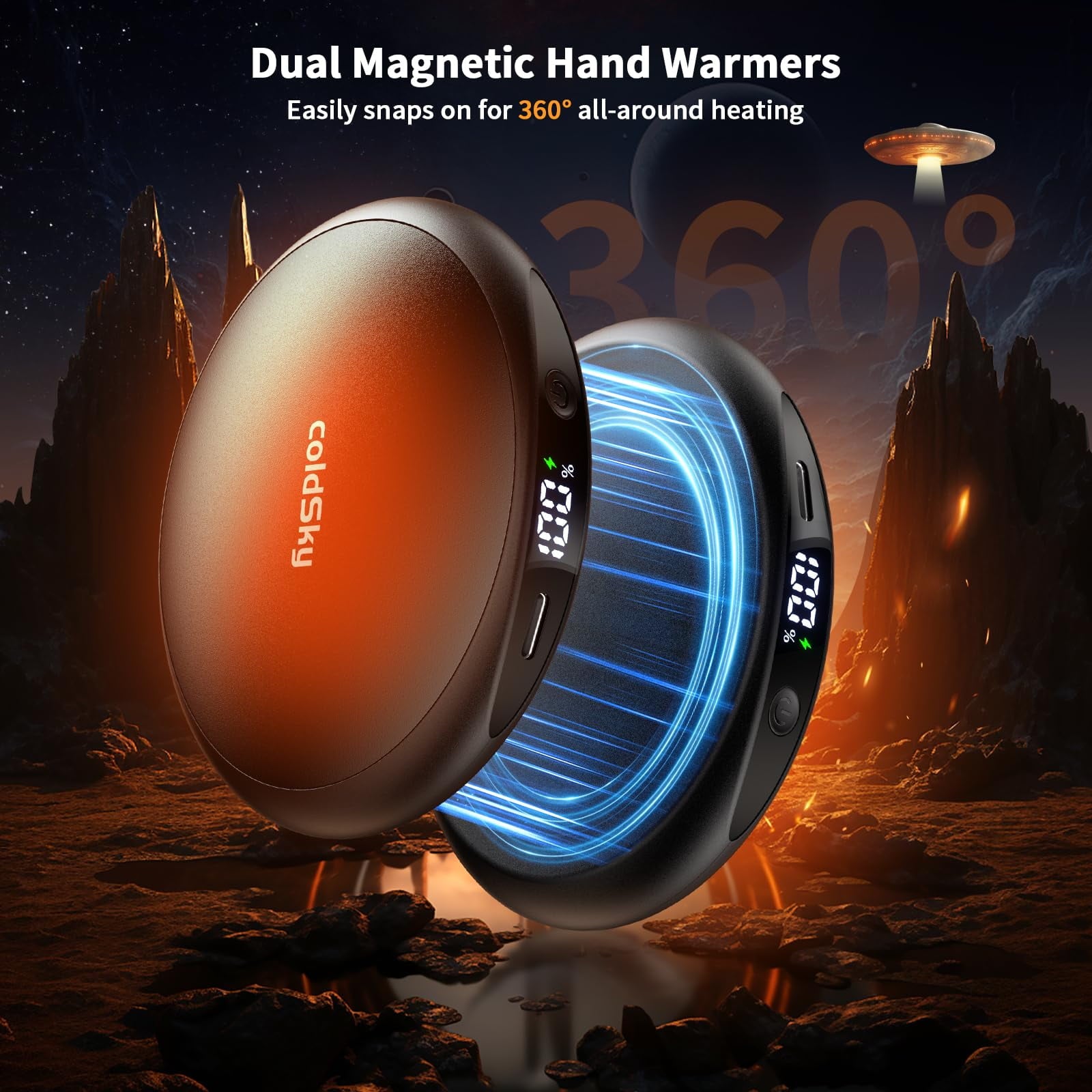 • ‌Dual magnetic hand warmers offering 2-in-1 versatility—snap together for double-sided warmth or separate for individual or shared use.