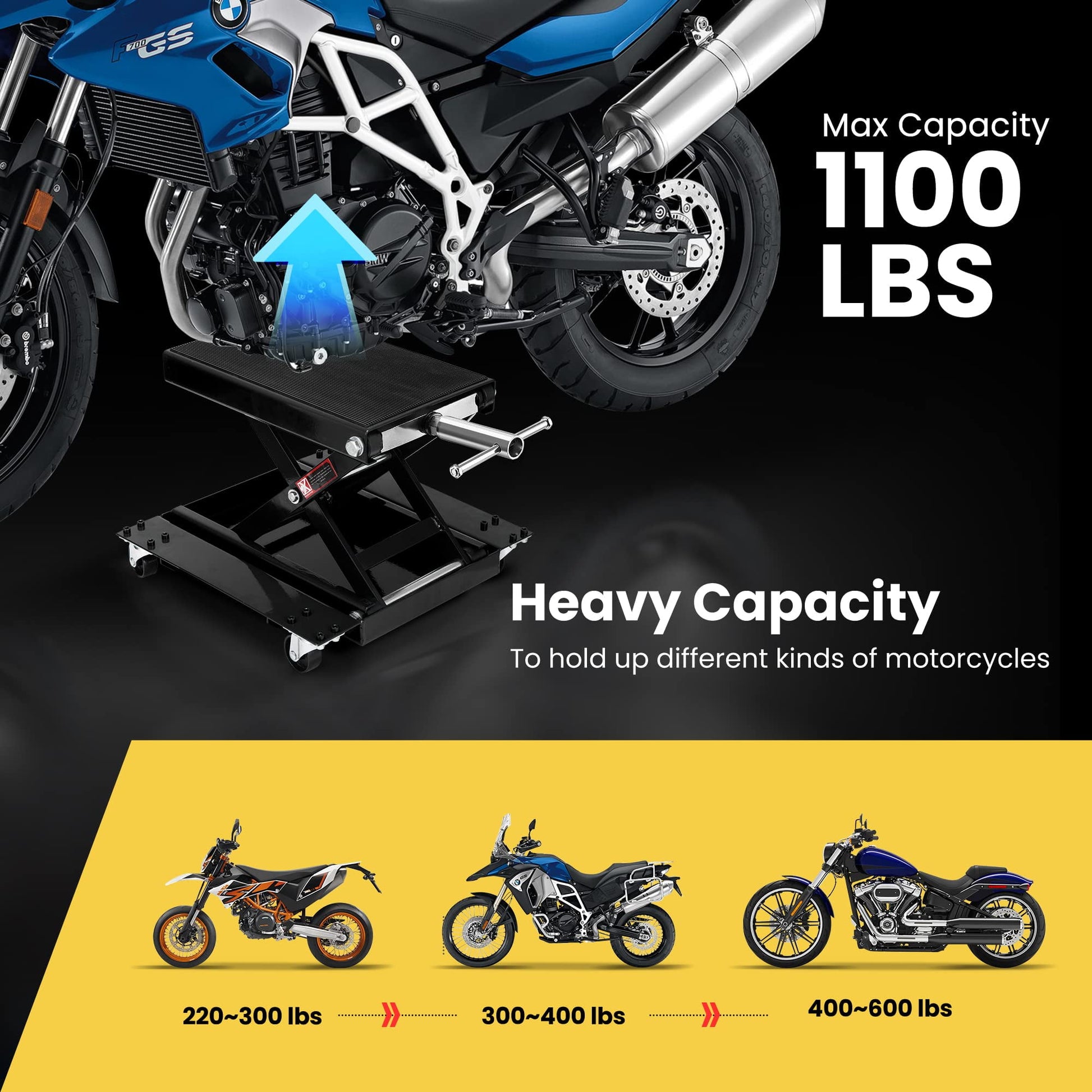 - HIGH PERFORMANCE - With a max load capacity of 1100 lbs., the lift jack can raise motorcycle to a comfortable level for your work between 5.1"-17.7" (with dolly) or 3.75"-14.95" (without dolly); The jack itself can be simply lifted out of the dolly tray and set on the ground; It is perfect to use in the garage, shop or at the track