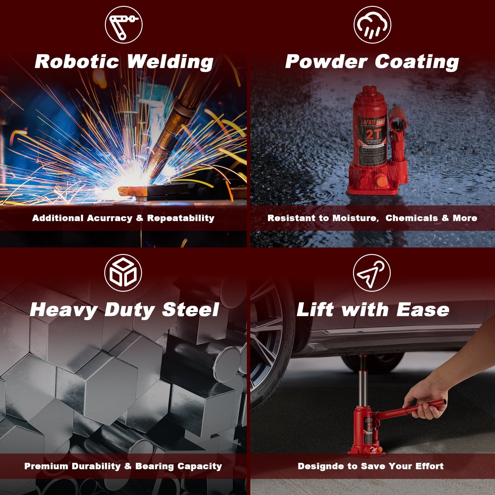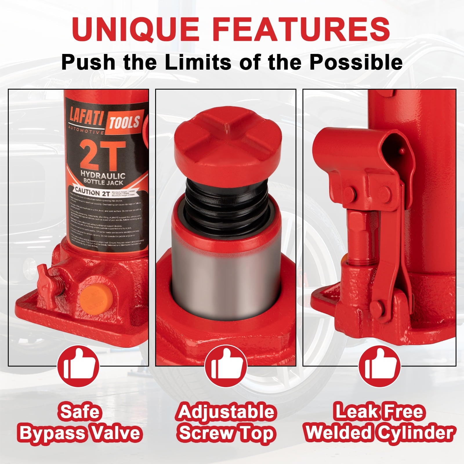 The Lafati 2-Ton Hydraulic Bottle Jack delivers professional-grade performance for home garages, auto shops, and job sites. Engineered with drop-forged alloy steel and a welded leak-proof core, it withstands repeated heavy use while maintaining hydraulic integrity.