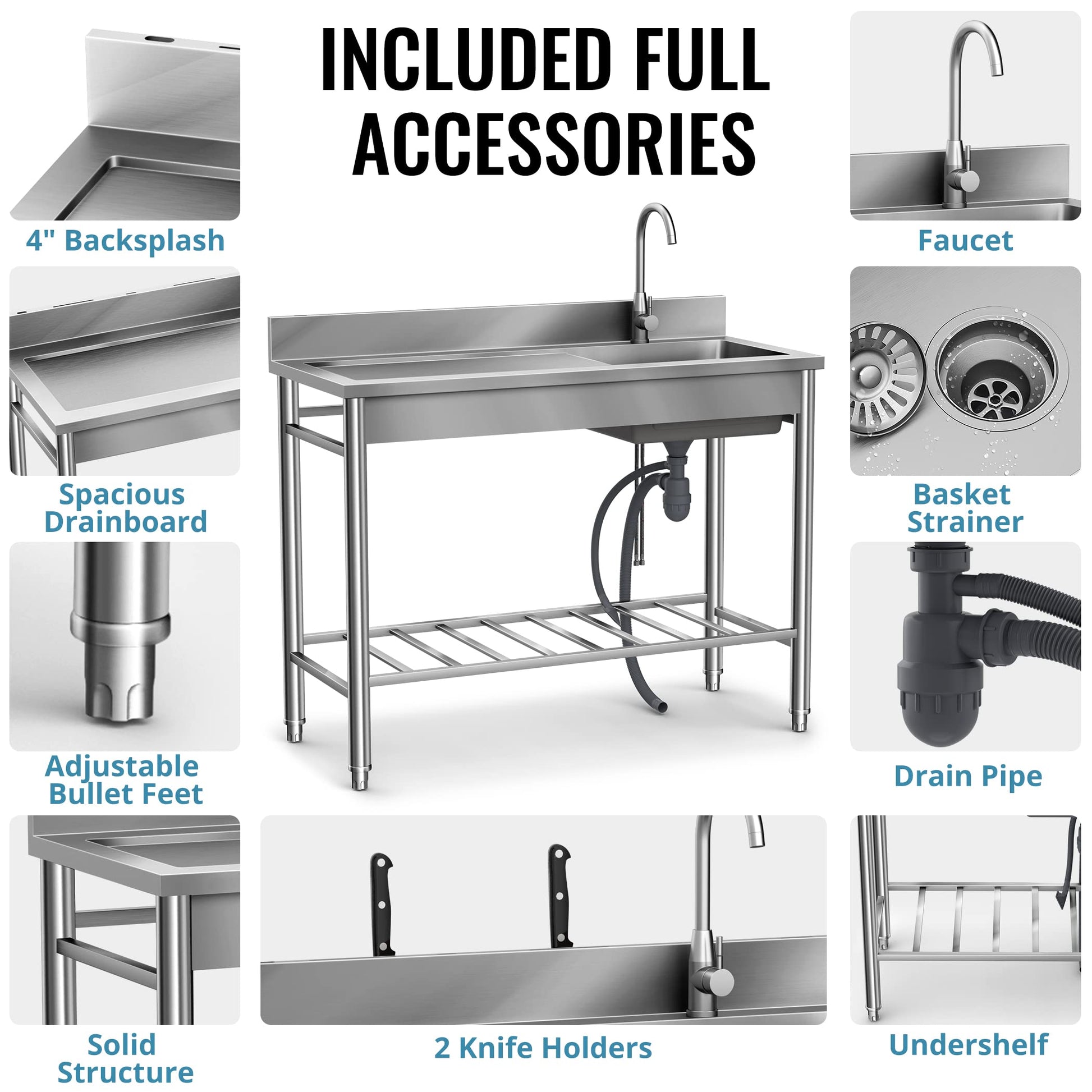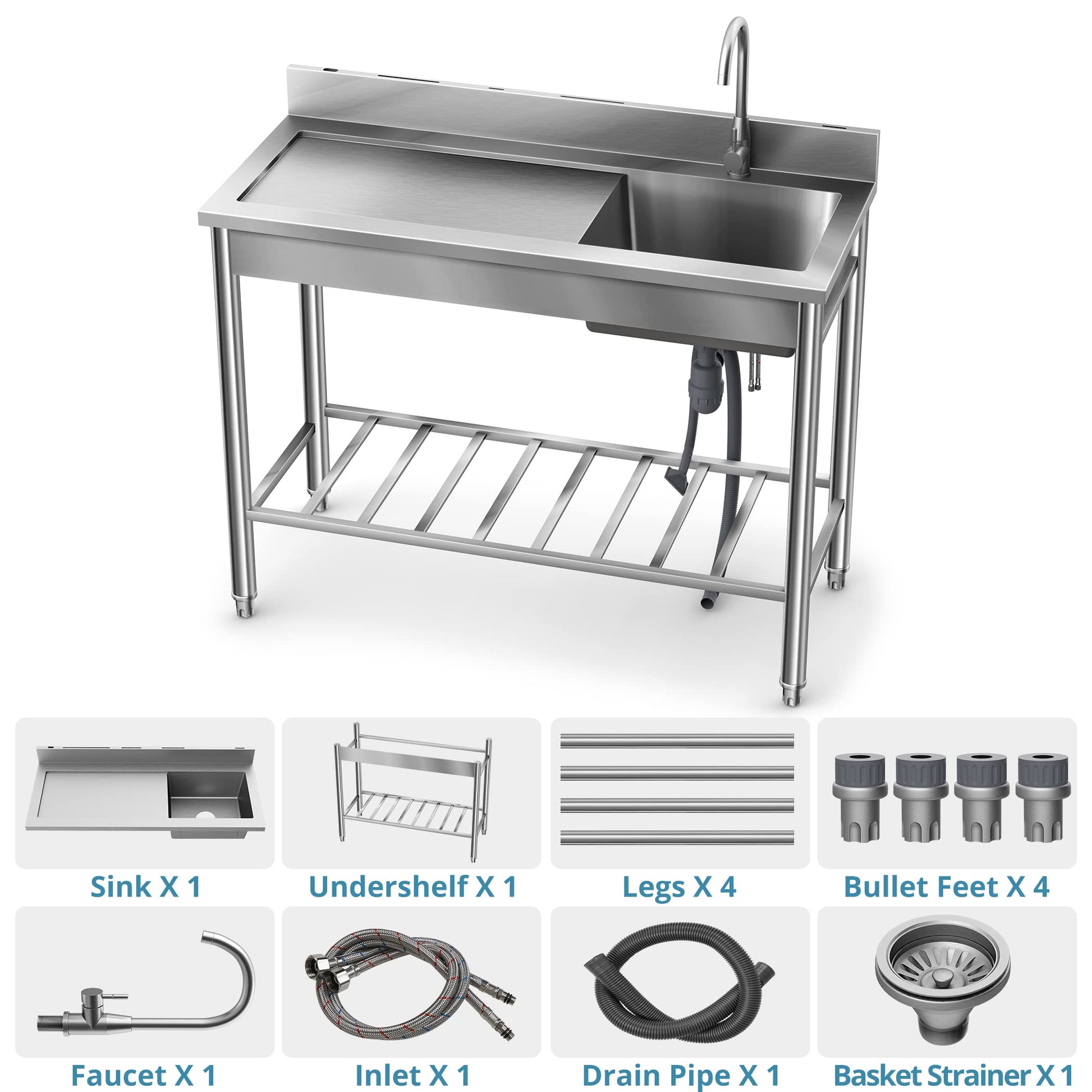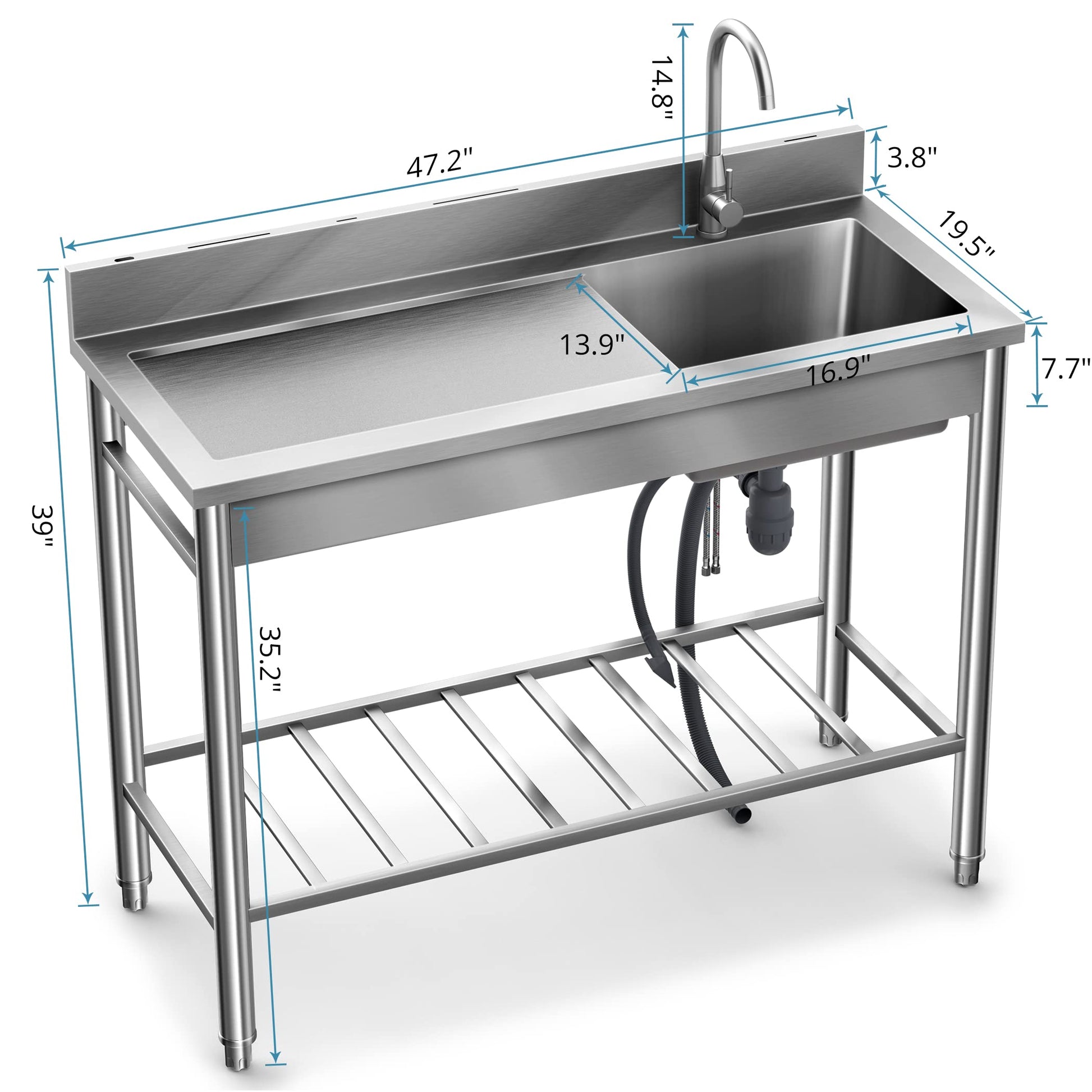 Lafati 304 SUS Stainless Steel Utility Sink - 47-Inch Free Standing Single Bowl Sink with Cold & Hot Water Faucet and Undershelf