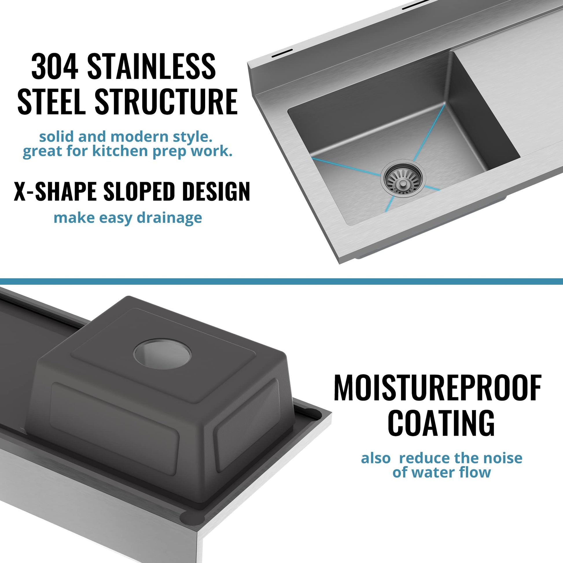 - Crafted from high-quality 304 SUS stainless steel, this sink is built to last. It resists corrosion, staining, and wear, ensuring it stays looking great for years to come.