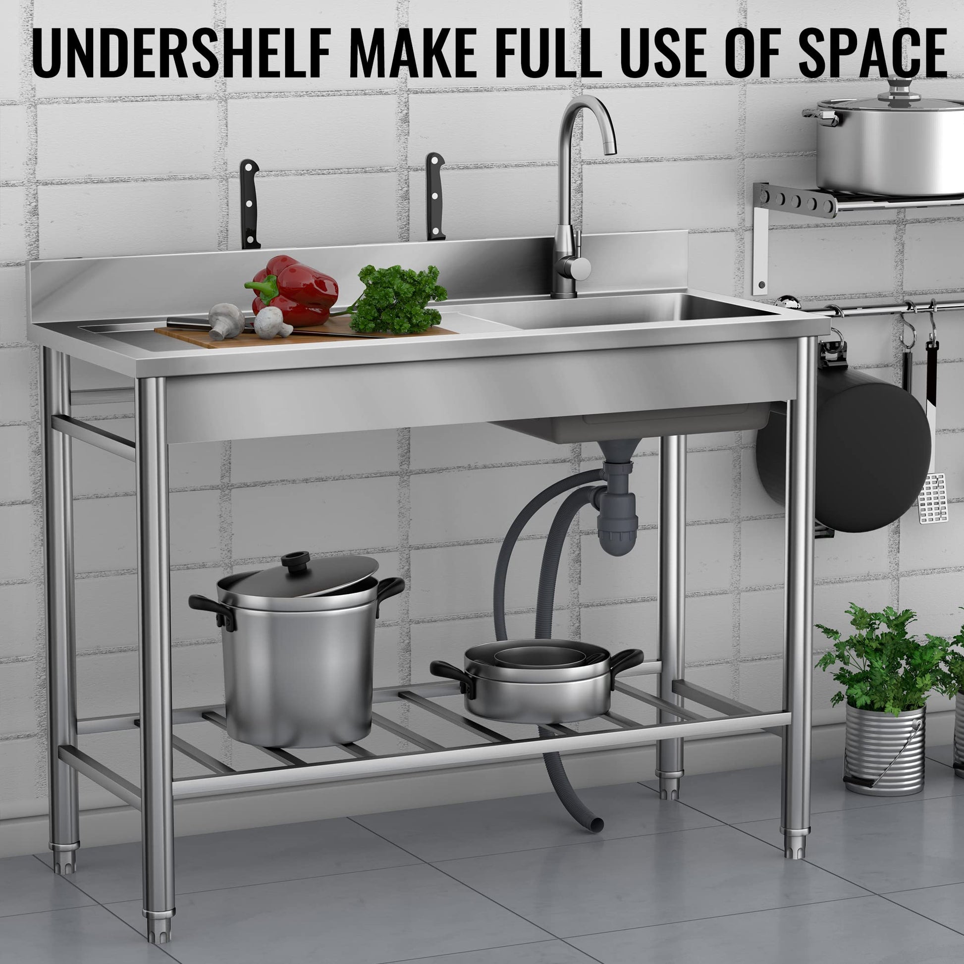 - The built-in undershelf provides extra storage space for your cleaning supplies, detergents, or kitchen essentials, keeping your workspace organized and clutter-free.