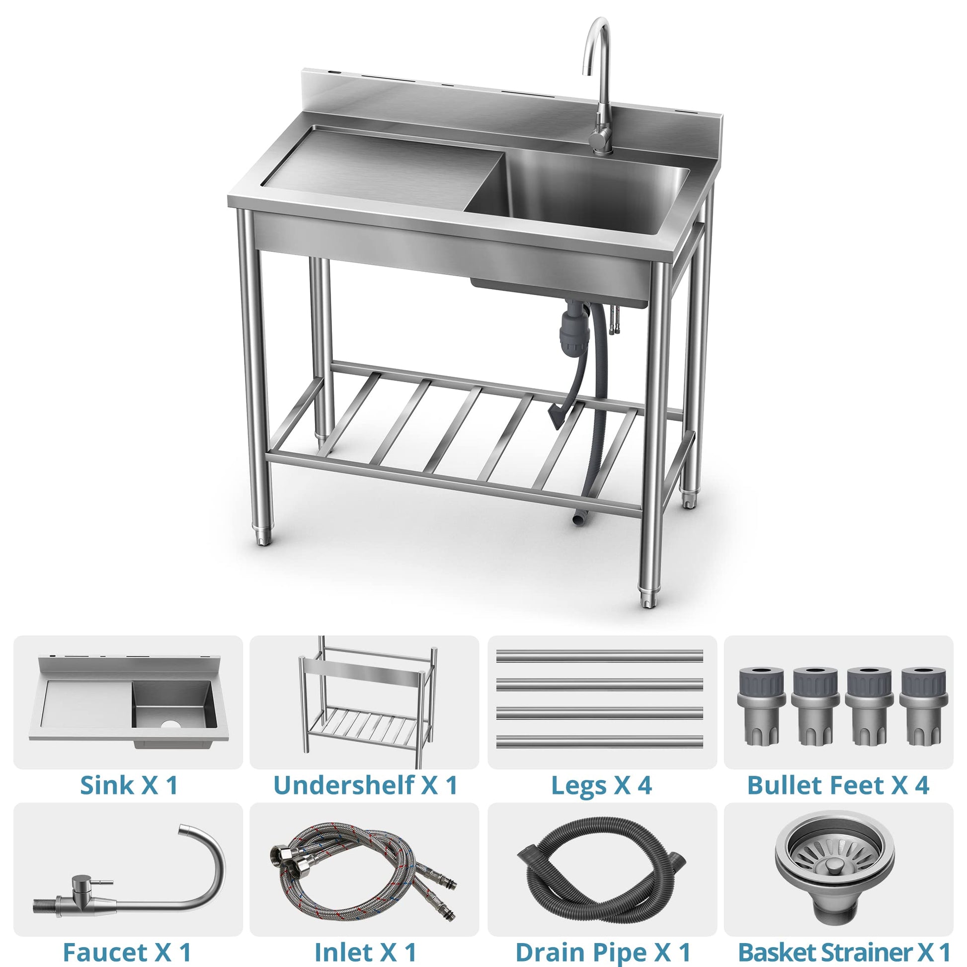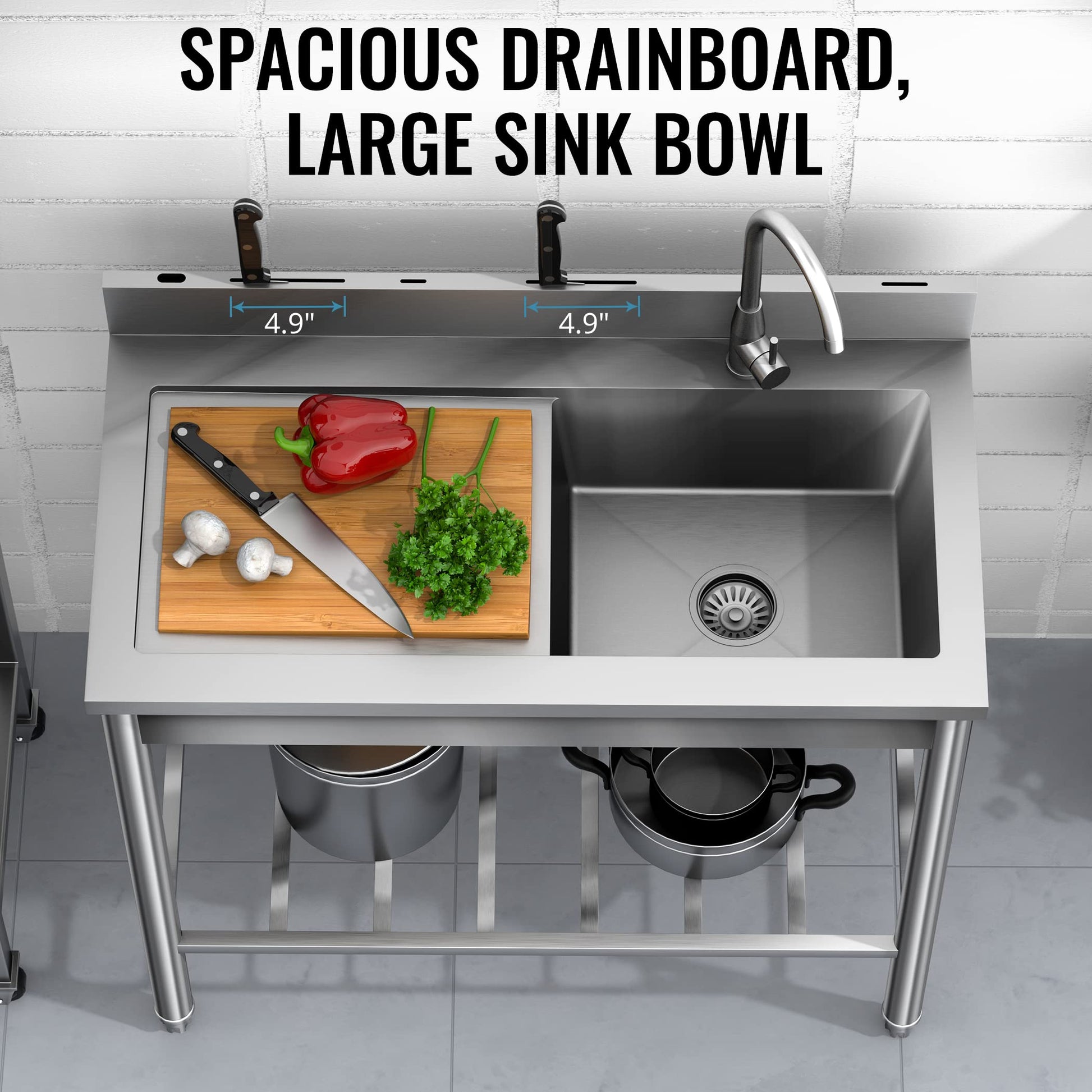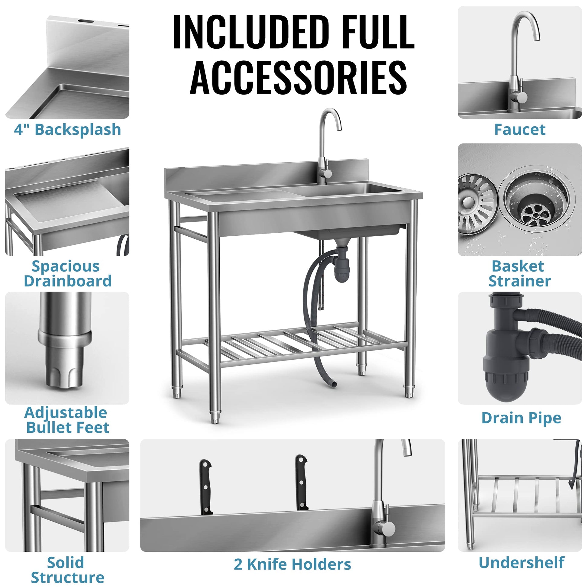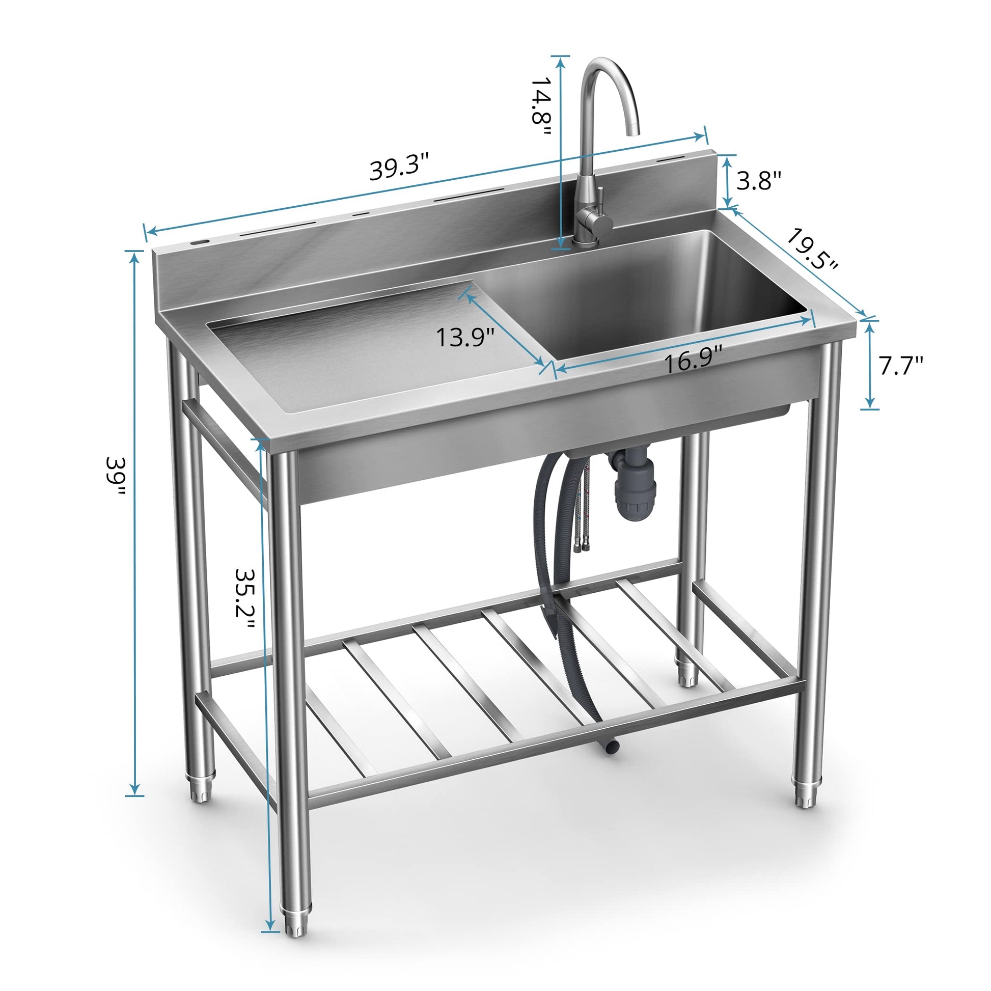 LAFATI Stainless Steel Utility Sink - 304 SUS, Free Standing Single Bowl with Large Work Station, Faucet, and Drainboard (39 Inch)