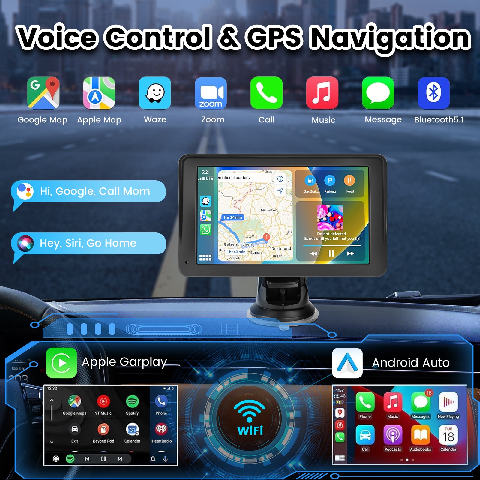 Portable Car Stereo Wireless Carplay Android Auto,7 Inch Touch Screen Car Radio with Bluetooth Hands-Free/Mirror Link/Maps Navigation/Voice Control/TF Card/AUX,for Cars, Trucks, SUVs