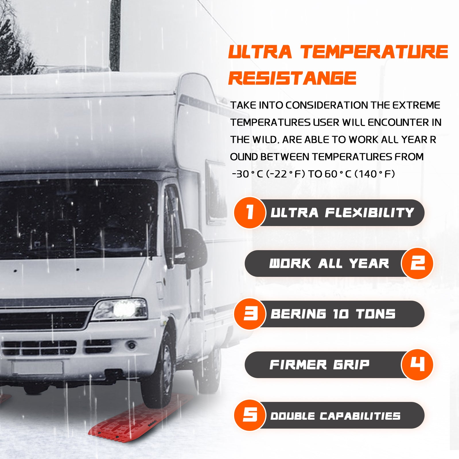 [OPTIMIZED CONSTRUCTION]:The specially designed teeth of our tracks board effectively grip tires, preventing slipping even under extreme conditions. The contoured ramps make it easy for your vehicle to climb up, while the heat-resistant material ensures durability during intense wheel spins.