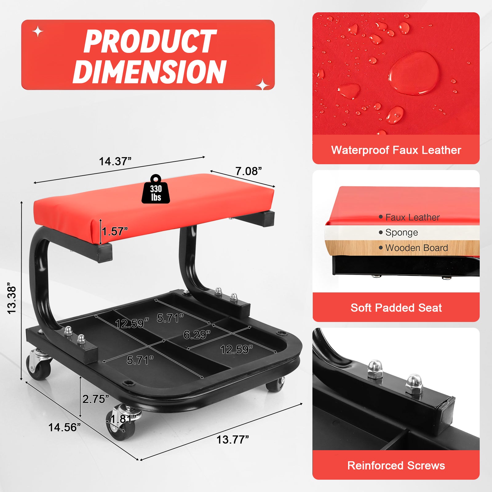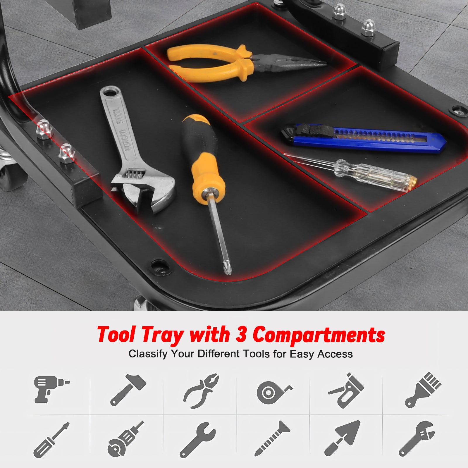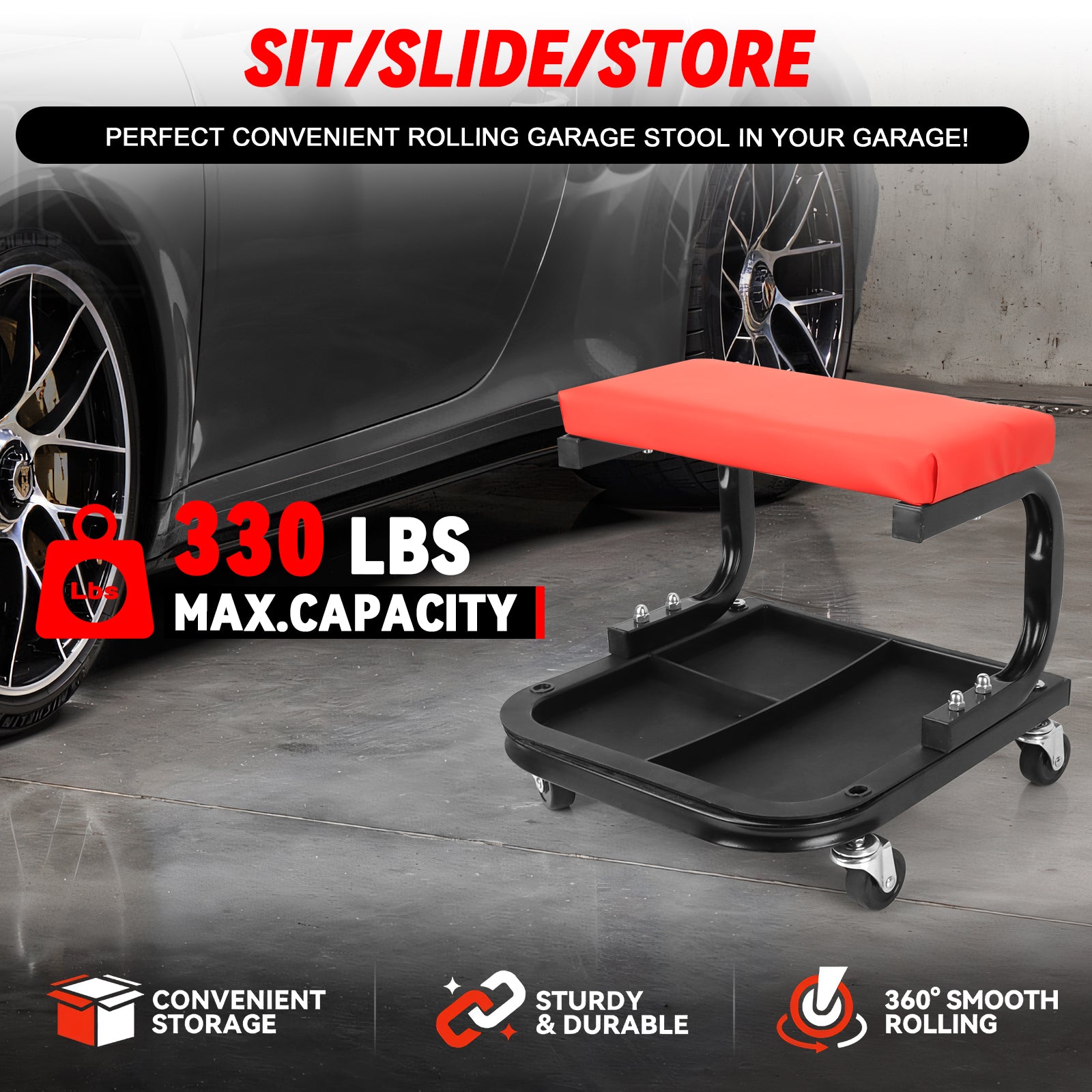 Rolling Creeper Garage/Shop Seat, Soft Padded Mechanic Stool with Segmented Tool Tray Storage, Heavy-Duty Garage Roller Seat with 4 Universal Casters, 330 LBS Capacity