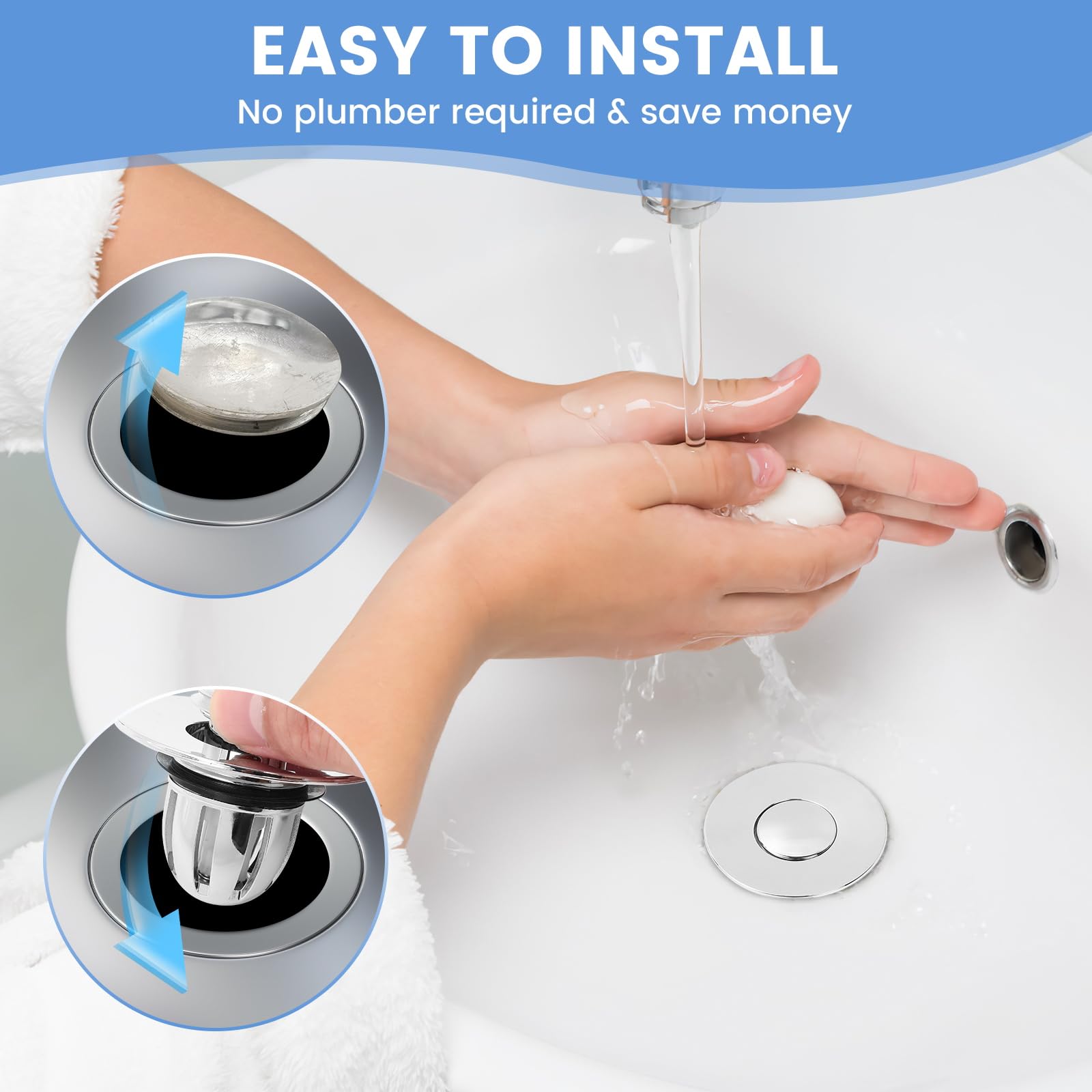 - Say goodbye to plumbing headaches with our easy-to-install sink stopper. It requires no tools and just 10 seconds to replace your old stopper, offering a seamless integration with your sink. A simple press activates the plug or drain filter function, streamlining your bathroom experience.