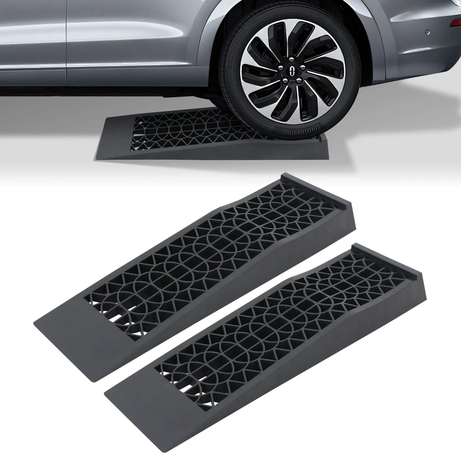 Looking for a sturdy yet effortless way to lift your car? Try our dual-pack car ramps. Each ramp can support up to 3300 pounds, with a combined capacity of 6600 pounds, making them suitable for a variety of vehicles. Made from high-strength PP material, they are both lightweight and durable. The scientifically designed 8.3-degree slope ensures smooth and safe vehicle entry and exit. The unique honeycomb surface not only enhances tire grip but also facilitates the cleaning of rainwater and debris, making them a great helper for vehicle maintenance whether in the garage or outdoors.