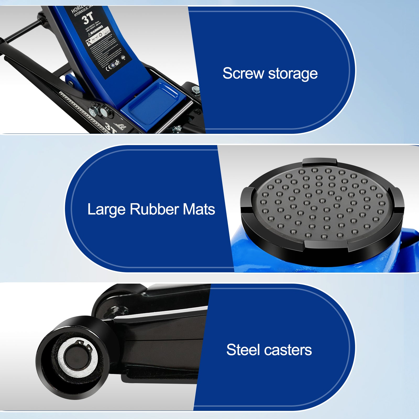 3 Ton / 6600 lbs Low Profile Floor Jack, Dual Piston Quick Lift Pump, 75mm-460mm Lifting Range, Heavy-Duty Steel with 360° Rubber Saddle and Foam Handle - Blue