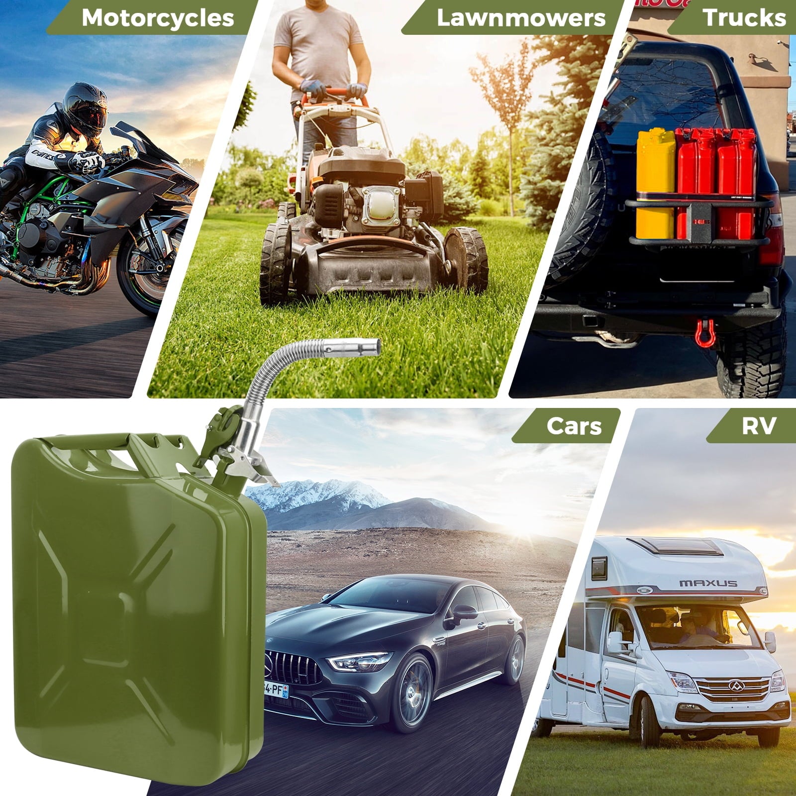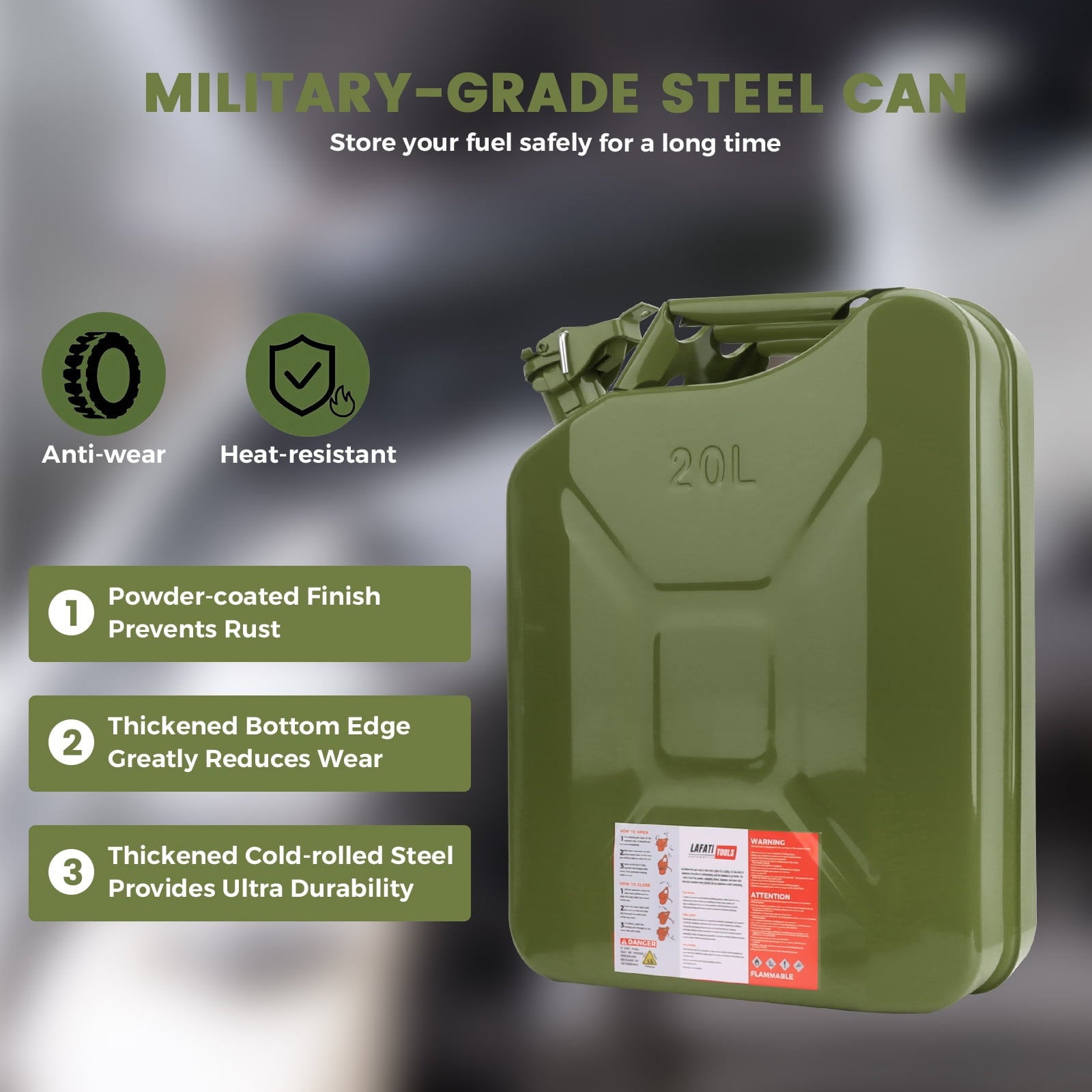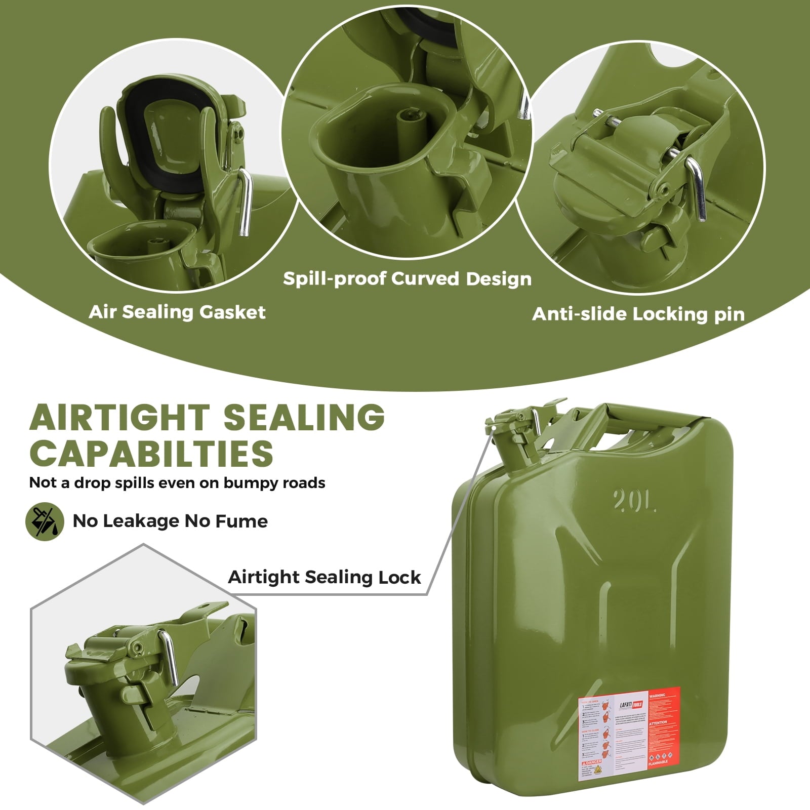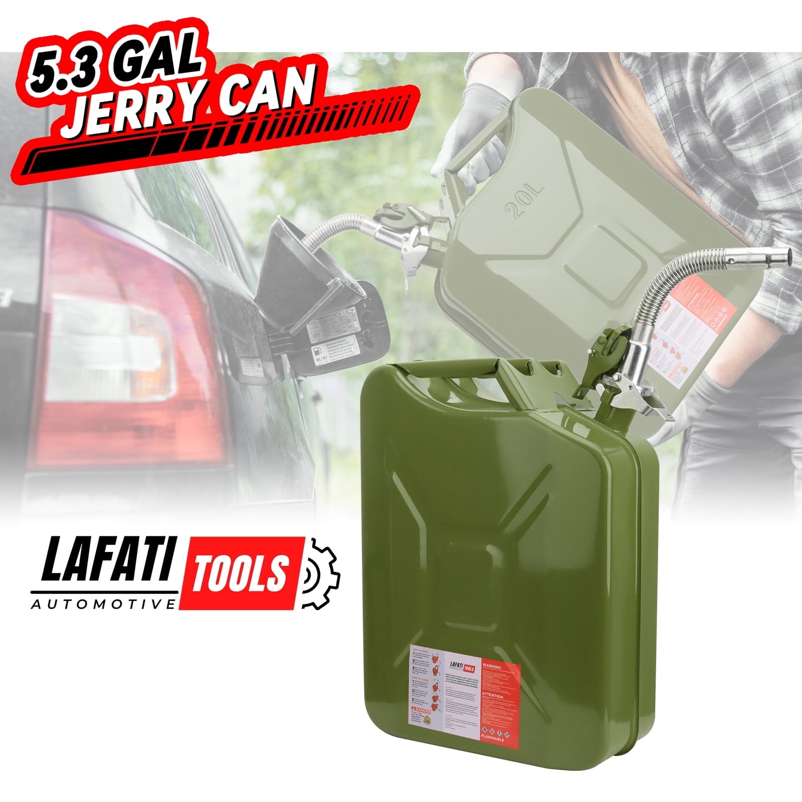 - Specifications:Material: Heavy gauge steel with fuel-resistant coatingCapacity: 20L (5 Gallon)Dimensions: [Insert dimensions if available]Weight: [Insert weight if available]Color: GreenIncluded Accessories: Metal pouring spout with flexible rubber extension
